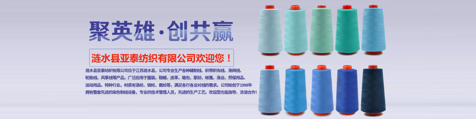 漣水縣亞泰紡織有限公司位于江蘇漣水縣,公司專業生產各種縫制線、織帶織布線、漁網線、輪胎線、風箏線等產品,廣泛應用于服裝、鞋帽、皮革、箱包、家紡、帳篷、漁業、勞保用品、運動用品、特種行業,材質有滌綸、錦綸、氨綸等,滿足各行各業對線的需求。公司始創(chuàng)于1998年,擁有整套先進的染色制線設備,專業的技術管理人員,先進的生產工藝。歡迎您光臨指導、洽談合作!